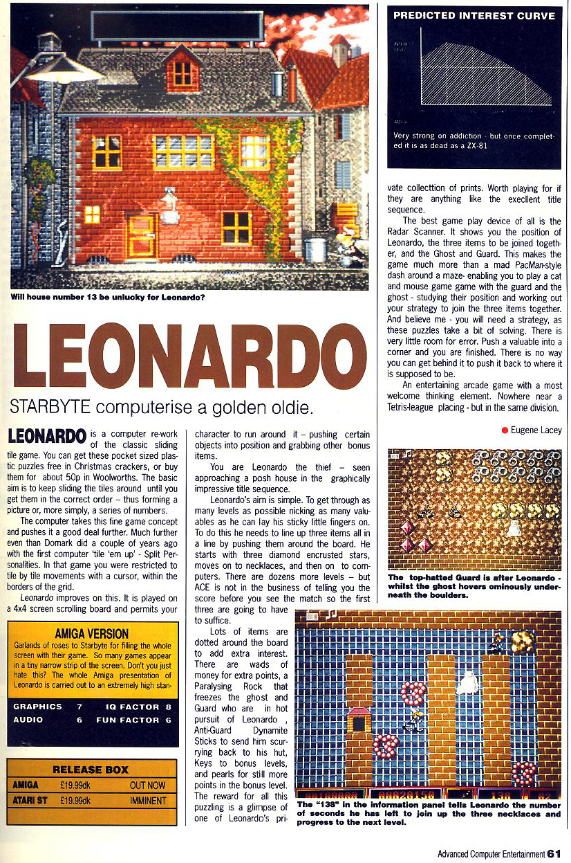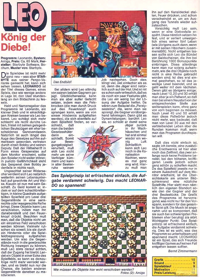Aus einem Testbericht: LEONARDO ist der Titel dieses Games, eines Spiels, das wie wenige andere in Lage ist, den User stundenlang an den Bildschirm zu fesseln. Held und Namensgeber des Programms ist Leonardo, ein kleiner Dieb und in einschlägigen Kreisen besser als Leo bekannt. Leo schlägt sich mehr schlecht als recht durchs Leben. fristet mit seinen gelegentlichen Beutezügen ein eher bescheidenes Ganovendasein Natürlich ist auch längst das Auge des Gesetzes auf ihn aufmerksam geworden. Dass der Hilfssheriff in Form eines Gespenstes auf dem Monitor erscheint, sollte den Spieler nicht weiter stören. In puncto Gefährlichkeit steht das Gespenst dem Bobby jedenfalls in nichts nach.